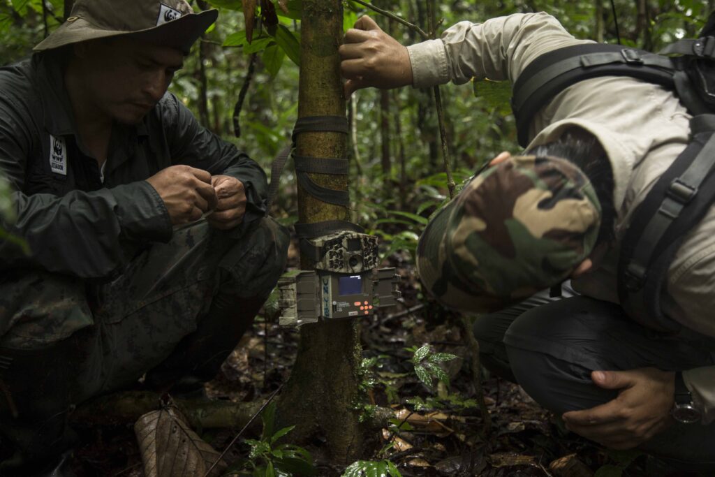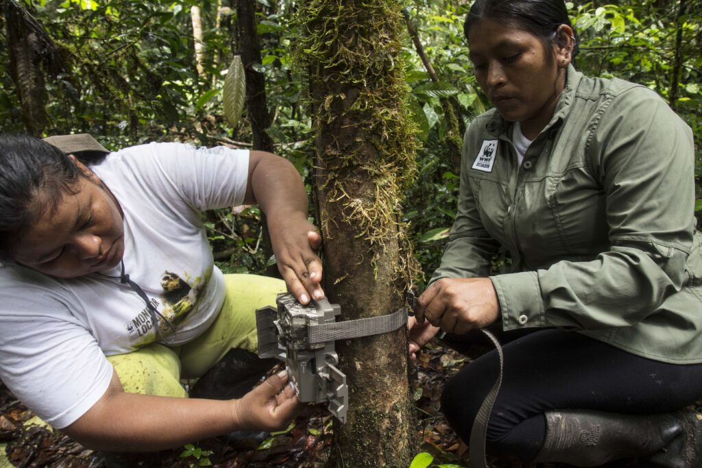 Hombres y mujeres involucrados en este proceso recibieron el equipamiento. Además, los técnicos de la WWF y del MAE les capacitaron en el manejo de GPS o sistema de ubicación y de las cámaras trampa. Claudia Gualinga, por ejemplo, aprendió a instalarlas, darles mantenimiento, recoger la información de las cámaras en el sitio mismo e interpretar datos.